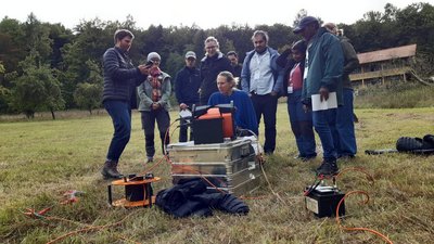 Zusätzlich hatten die Teilnehmer:innen an zwei Nachmittagen die Gelegenheit, selbst sowohl Time Domain und Frequency Domain IP-Messungen im Feld, als auch Messungen der Spektralen Induzierten Polarisation im Labor durchzuführen. Zu diesen praktischen Erfahrungen gehörte außerdem die Auswertung der selbst gemessenen Feld-Daten mit pyGIMLi (Johannes Hoppenbrock, TU Braunschweig).
