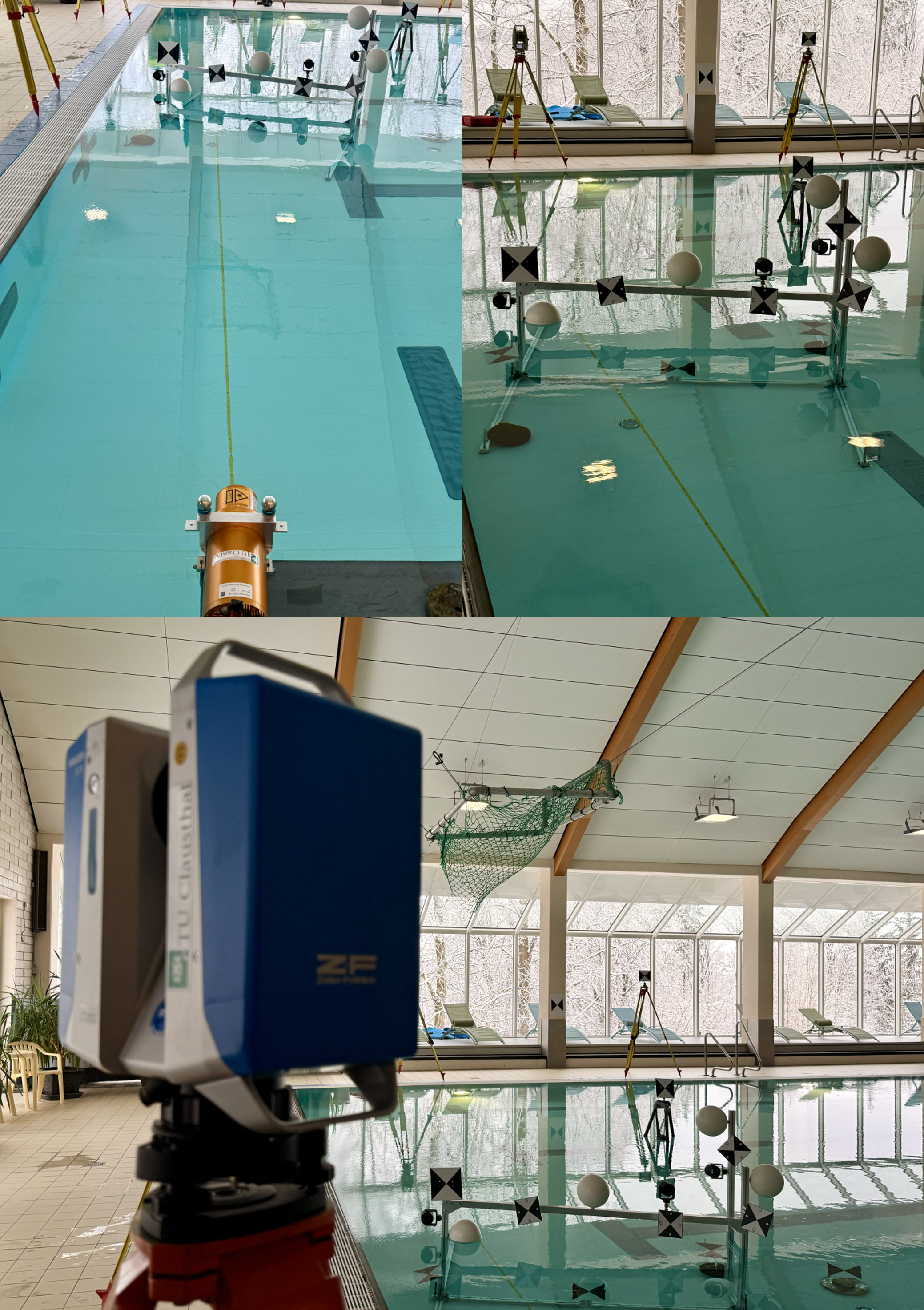 Um verlässliche Bezugspunkte für die gemeinsame Auswertung der beiden 3D-Punktwolken (Z+F IMAGER 5016A und ULi) zu schaffen, wurden Zielzeichen an mehreren Stellen angebracht: am Beckenrand, innerhalb des Wassers sowie an einem eigens entwickelten Aluprofilrahmen, an dem die Targets dauerhaft befestigt waren. Es wurden sowohl flächenhafte Zielzeichen mit Schachbrettmuster als auch Kugeln eingesetzt. Weiterhin wurden am Aluprofilrahmen sowie am ULi angebrachte Prismen mit einem Tachymeter beobachtet. Die ebenfalls mit dem Tachymeter bestimmten Positionen der Zielzeichen am Beckenrand erlauben so die gegenseitige Positionskontrolle des ULi und des Aluprofilrahmens, um eine ungewollte Bewegung der beiden Kernelemente des Experiments aufdecken zu können.