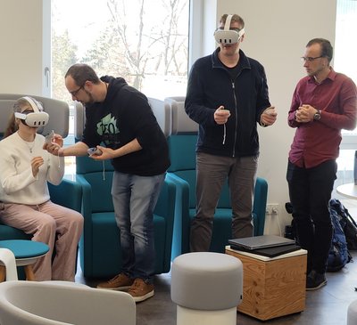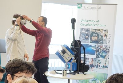 Im Workshop „Die Welt unter unseren Füßen: Von der 3D-Punktwolke zur virtuellen Realität“, welcher vom IGMR-Geomatics gestaltet wurde, erhielten die Jugendlichen zunächst eine kurze Einführung in die Grundlagen des terrestrischen Laserscannings und die Vorstellung eines portablen (Z+F FlexScan22) und stationären Laserscanners (Leica RTC 360). Anschließend konnten sie sich mittels VR-Brille selbst durch das geometrische Modell des Untertagelabors der „Reichen Zeche“ (Freiberg, Deutschland) bewegen.